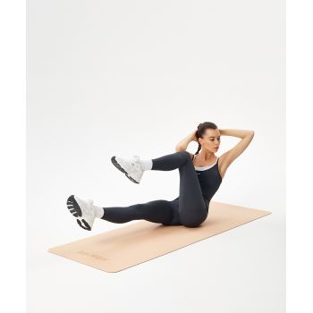 Коврик для фитнеса имеет толщину 0,4 см и рассчитан на нагрузки средней интенсивности. Он значительно тяжелее схожих на рынке, что делает его еще более долговечным. На этой модели можно заниматься даже в обуви. Изделие приятно на ощупь, тренироваться на нем комфортно.