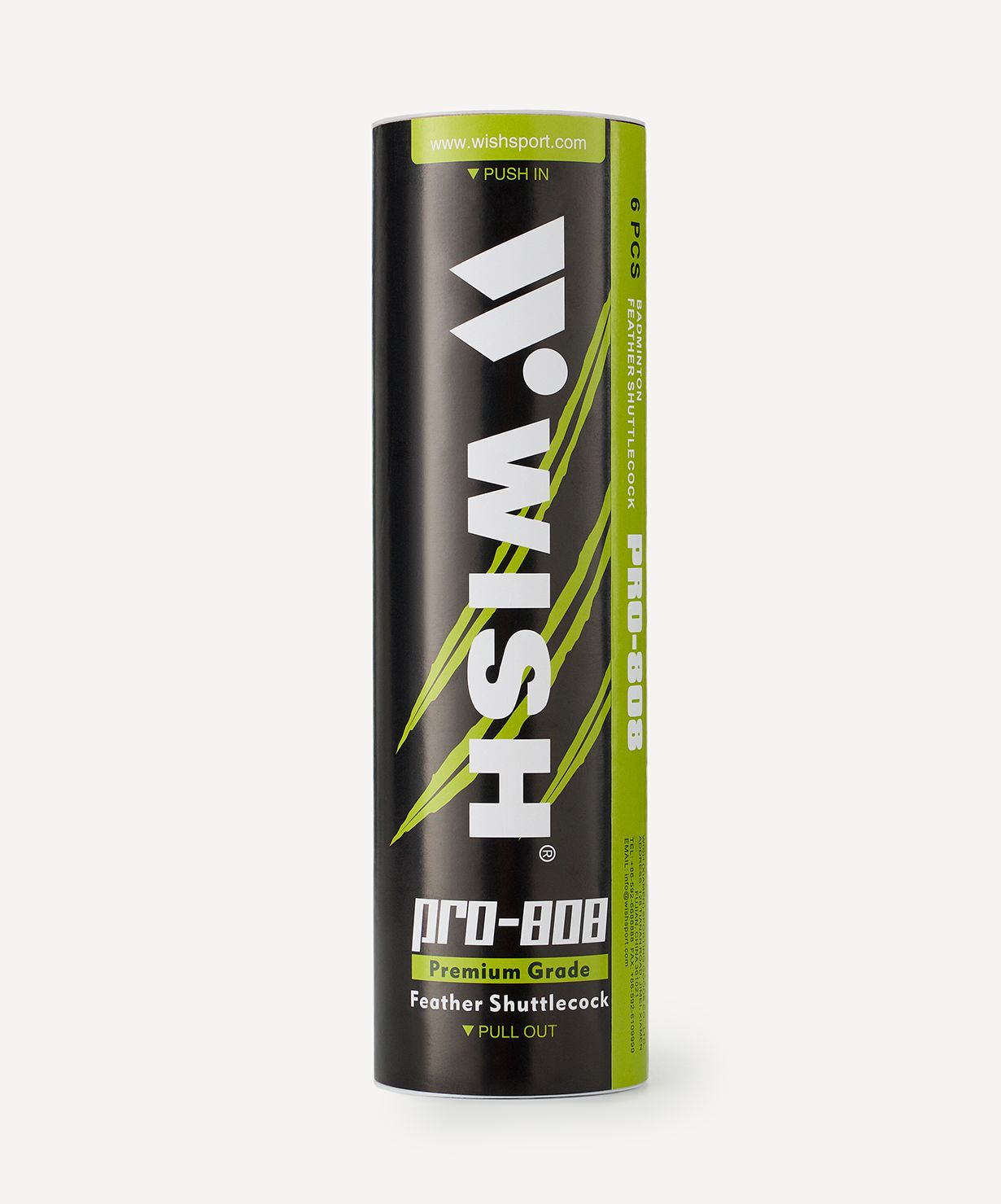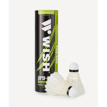 Набор воланов для бадминтона WISH S-808 состоит из 6 перьевых снарядов, упакованных в тубу. Юбка волана для бадминтона изготовлена из гусиного пера, голова волана – из ЭВА. Они предназначены для тренировок и обучения, имеют среднюю точность полета. Скорость таких перьевых воланов для бадминтона подходит для игры при температуре 12-23 ⁰С и в общей классификации относится к категории «средняя».