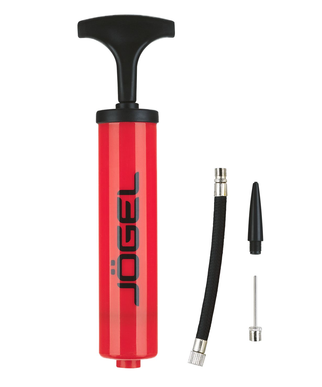 Универсальный ручной насос красного цвета с Т-образной ручкой – полезный аксессуар от бренда Jögel. Модель эффективна при накачке мячей любых типов. Благодаря небольшим габаритам и удобной упаковке насос легко брать собой в поездку. В комплект входит гибкий съемный шланг под автомобильный ниппель Schrader, стандартная игла с диаметром резьбы 7 мм и насадка для фитбола.